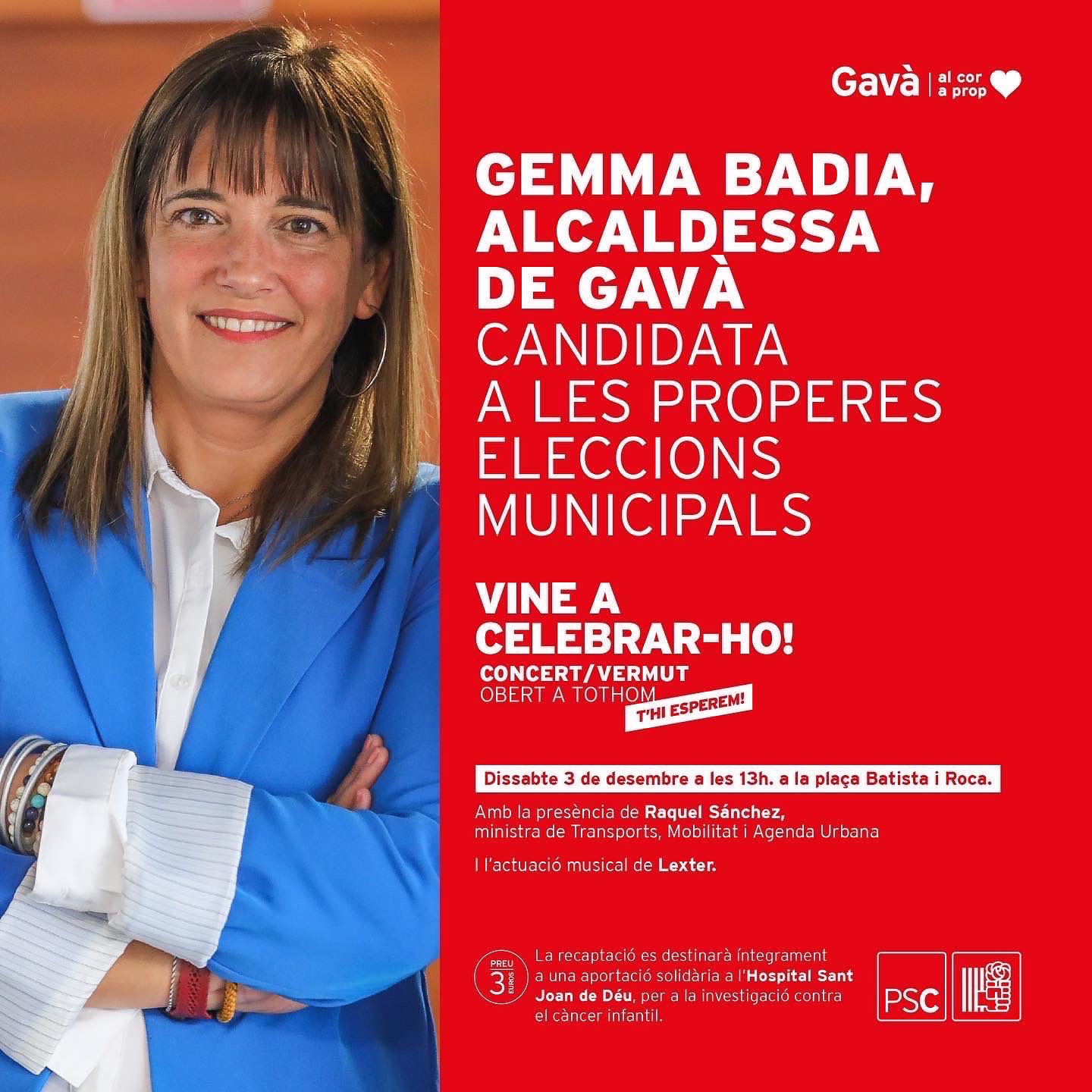 Aquest passat dissabte, dia 3 de desembre, l’alcaldessa de Gavà, Gemma Badia, va presentar públicament la seva candidatura a l’alcaldia en les eleccions de maig de 2023 en un acte celebrat a la Plaça Batista i Roca de la seva ciutat.
