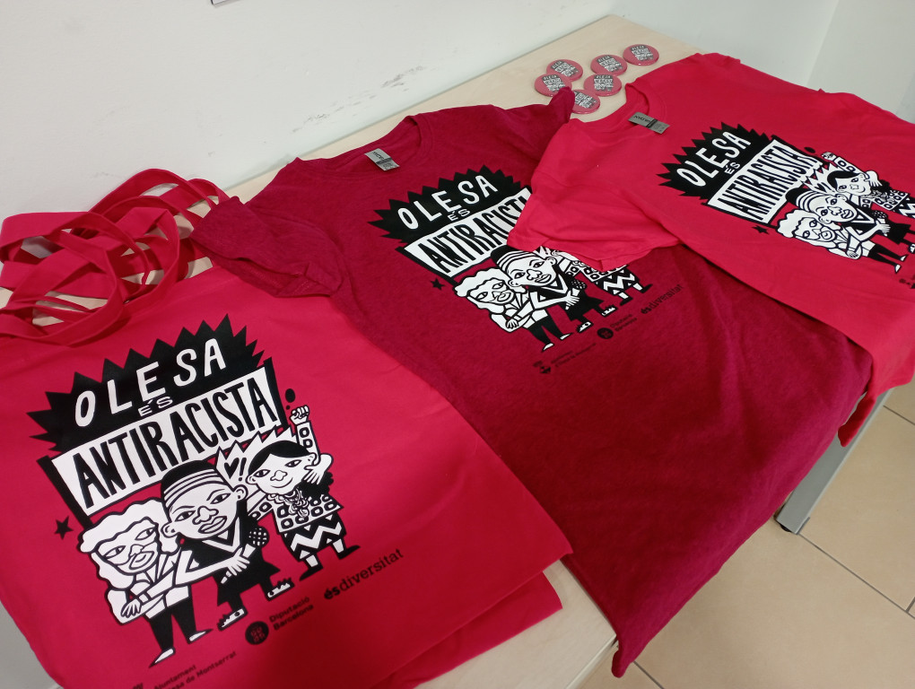 La campanya inclou la impressió de material com samarretes, bosses i xapes amb l’eslògan “Olesa antiracista” (a la fotografia). “La campanya reivindica els drets de les persones migrades i racialitzades” i la lluita contra la vulneració dels seus drets, ha explicat la Cap del Departament, Alba Tarroc.