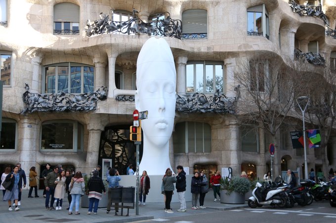 Fora de l’edifici s’ha situat la peça “Flora” ( a la fotografia), una obra del 2021, ubicada al passeig de Gràcia, davant la façana de la Casa Milà, i que ha suscitat l’interès de moltes persones que s’apropen a contemplar-la i a fer-se fotografies.