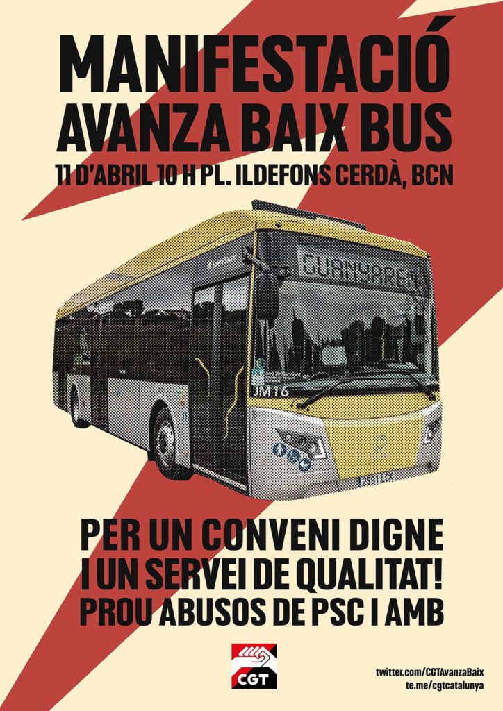 La secció sindical de la CGT d’Avanza ha convocat també una manifestació el dimarts, a les 10 del mati, a Barcelona ( a la fotografia), que començarà a la Plaça Ildefons Cerdà, recorrerà la Gran Via fins a la Plaça Espanya, primer, i arribarà fins la Plaça Sant Jaume, després. La mobilització denuncia els “abusos del PSC i AMB”. El vicepresident  de Transports de l’AMB és el senador Antoni Poveda, primer secretari derl PSC del Baix Llobregat i exalcalde de Sant Joan Despí.