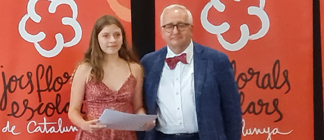 Durant l’acte, presidit per la nova consellera d’Educació, Anna Simó, es va guardonar l’alumna de l’Escola Mestral de Sant Feliu de Llobregat, Emma Remolà, pel seu poema “Set mirades capitals”. Remolà es va endur el guardó en la categoria de poesia de 1r i 2n d’ESO, després que el jurat destaqués que “es tracta d’un interessant exercici poètic encertadament conduit, amb un notable treball de rimes”. L’Emma Remolà va recollir el premi de mans del reconegut poeta Carles Duarte (a la fotografia), vinculat a Sant Feliu a través del Premi Martí Dot de Poesia i de la seva amistat amb Joana Raspall.