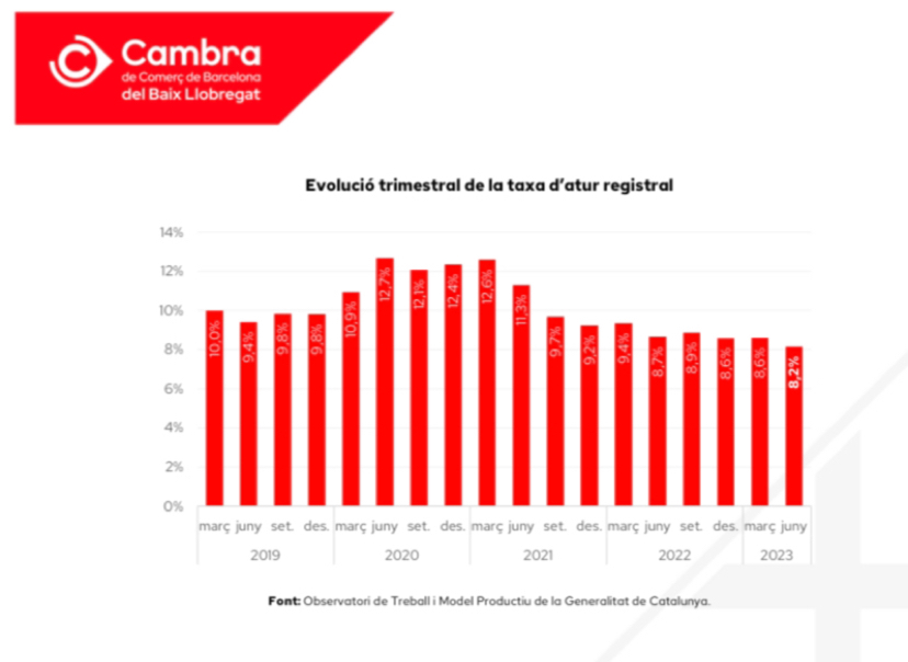 Així s’extreu del darrer Informe trimestral del mercat del treball i teixit empresarial elaborat pel Gabinet d’Estudis de la Cambra de Comerç de Barcelona i publicat per la Cambra territorial del Baix Llobregat, que també analitza el comportament que ha tingut del teixit empresarial, en termes de comptes de cotització, i el resum mensual de l’atur registrat.