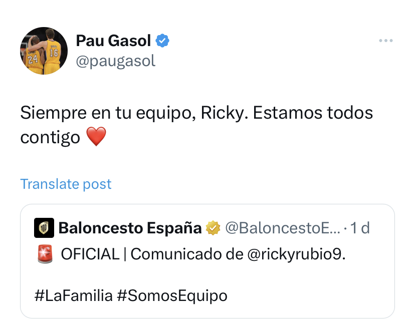 A tots aquests missatges de suport s’hi va sumar el baixllobregatí Pau Gasol. El de Sant Boi va piular immediatament després de l’anunci de Ricky: “Sempre al teu equip, Ricky. Estem tots amb tu ❤️”.