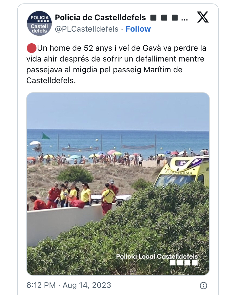 Un veí de Gavà, de 52 anys, va morir aquest diumenge 13 d’agost, després de patir un desmai al passeig marítim de Castelldefels.