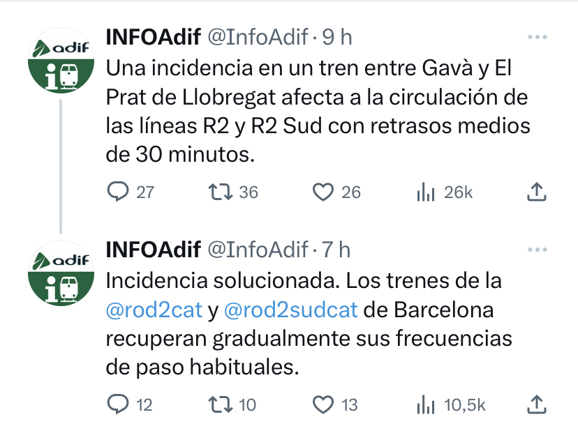 Una incidència entre Gavà i el Prat afecta l’R2 i l’R2 Sud i provoca retards mitjans de 30 minuts, segons ha informat Adif.