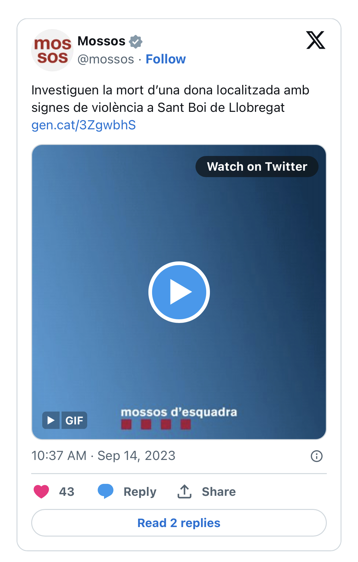 Els Mossos d’Esquadra investiguen la mort violenta d’una dona a Sant Boi de Llobregat. El cadàver de la víctima el van localitzar dilluns, 11 de setembre, en un domicili de la ciutat, tot i que la policia ho ha comunicat aquest dijous.