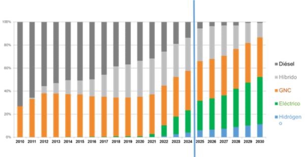L’aposta de TMB per la sostenibilitat a la seva flota de bus es mostra en el següent gràfic on es pot veure com evolucionarà el nombre de vehicles per tipus de combustible, reduint els dièsel i els híbrids mentre guanyen terreny els elèctrics i els d’hidrogen: