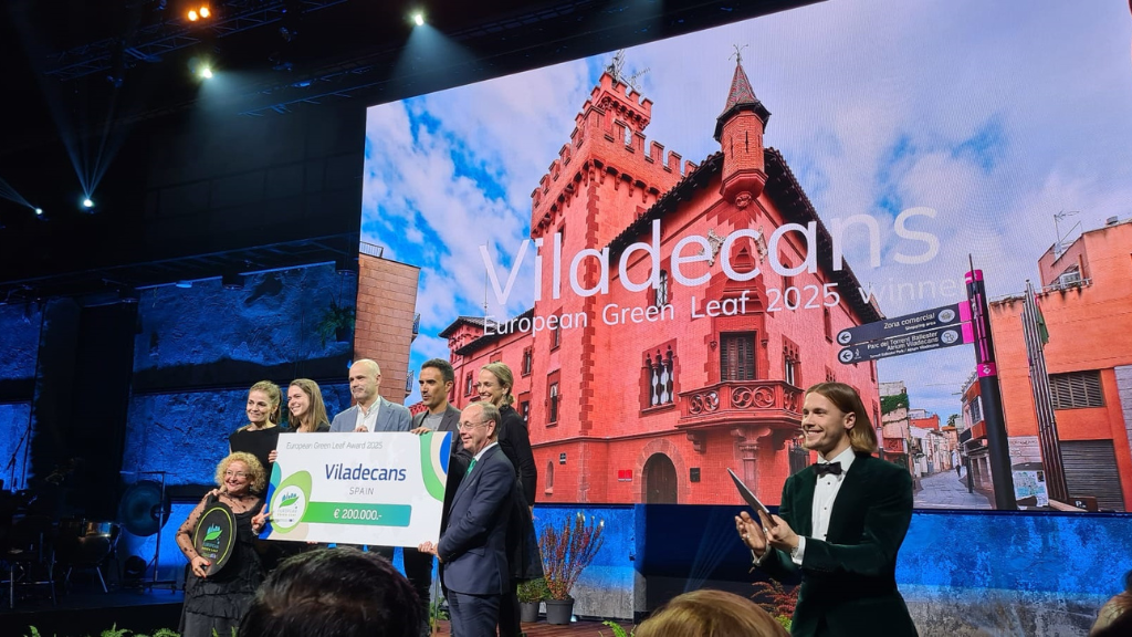 La Comissió Europea va concedir aquest dijous, 5 d’octubre, els premis Green Leaf 2025 a les ciutats de Viladecans ( Catalunya) i Treviso ( Itàlia). La cerimònia es va celebrar a l’auditori del KultuuriKatel (Tallin Creative Hub) de Tallin, capital d’Estònia. Entre les persones que van recollir el premi (a la fotografia) es trobava la tinenta d’alcalde de l’Àrea de Medi Ambient, Sostenibilitat i Patrimoni Cultural de l’Ajuntament de Viladecans, Encarni García. L’alcalde de la ciutat, Carles Ruiz, va agrair a les autoritats comunitàries “el repte que ens heu confiat: ara tenim dos anys per acabar de mobilitzar tota una ciutat i ser un exemple a tot Europa de vida saludable i de sostenibilitat”.