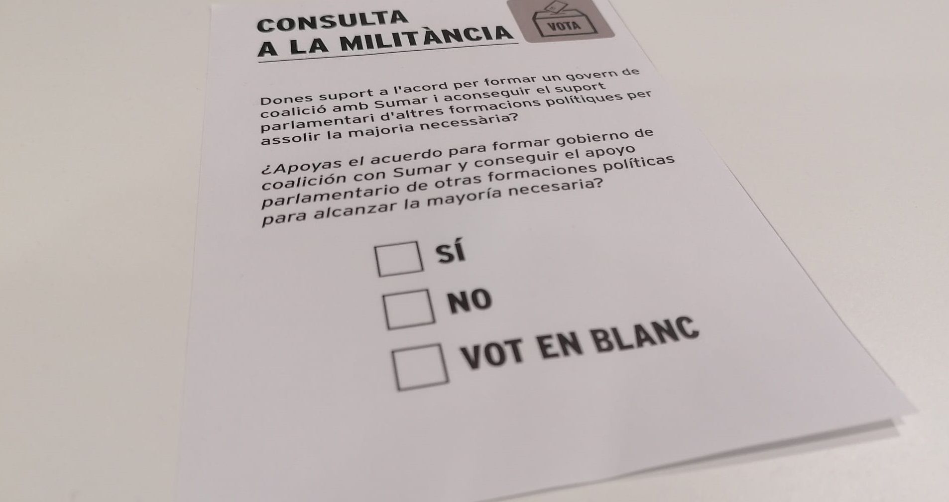 A Catalunya en Comú, el vot afirmatiu al pacte que ha de permetre un govern de PSOE i Sumar s’ha enfilat fins el 95’2 % en la votació que va acabar la nit d’aquest dilluns, 6 de novembre. Els vots contraris han estat del 2’4 % i els vots en blanc del 2’3%. La participació ha arribat al 54’4%.