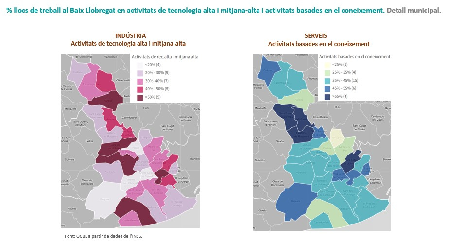 Pel que fa als serveis, el 41,8% d’aquests treballen en activitats basades en el coneixement, percentatge inferior als altres àmbits territorials. Cervelló (60,2%), Corbera de Llobregat (58,3%), Abrera (55,2%) i Sant Joan Despí (54,6%) són els municipis amb major percentatge d’activitats industrials de tecnologia alta i mitjana-alta. Castellví de Rosanes (66,3%), Sant Feliu de Llobregat (63,5%), Sant Esteve Sesrovires (56,3%) i Martorell (55,1%) són els municipis amb més proporció d’activitats basades en el coneixement del sector serveis.