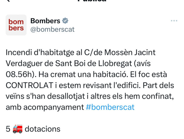 Els Bombers, que s’han desplaçat al lloc dels fets amb cinc dotacions, asseguren que l’incendi ja està controlat i que només resten les tasques de revisió de l’edifici.