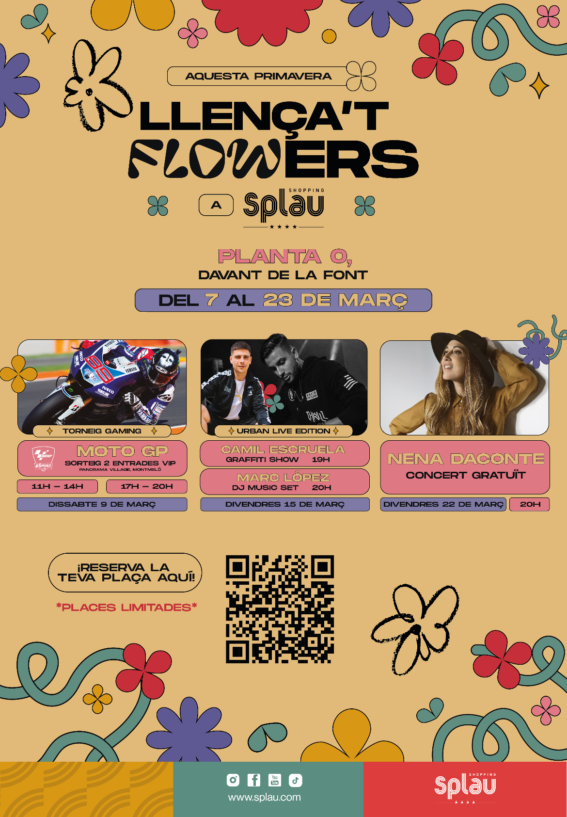 Splau donarà la benvinguda a la primavera amb la campanya ‘Llença’t flowers’, que entre el 7 i el 23 de març, portarà al centre comercial diversos shows i activitats com el concert de Nena Daconte, un torneig de gaming, un espectacle d’art en viu amb l’artista urbà Camil Escruela i el DJ Marc López, un joc de Scalextric Autònom per conscienciar sobre l’estalvi d’energia, córners de charms, ungles i trenes…