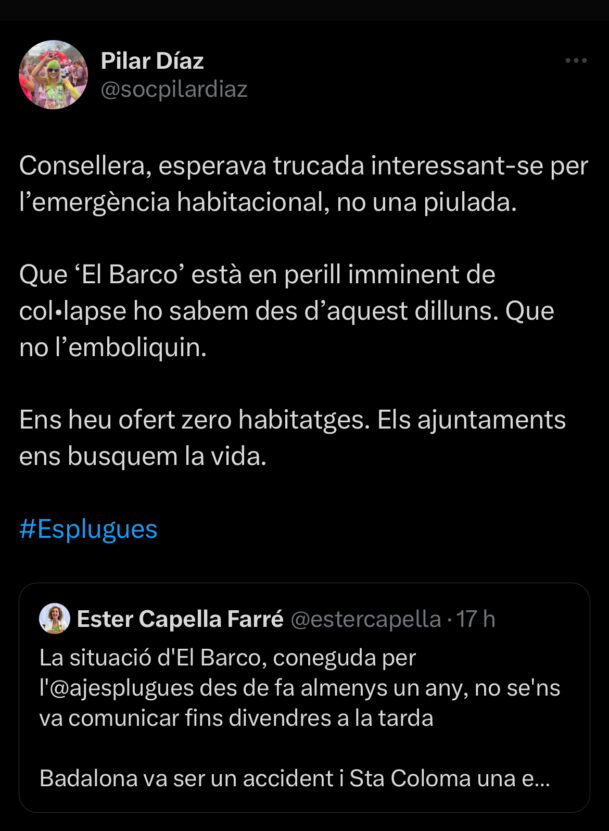 L’alcaldessa Pilar Díaz va respondre immediatament: “Consellera, esperava trucada interessant-se per l’emergència habitacional, no una piulada. Que El Barco està en perill imminent de col·lapse ho sabem des d’aquest dilluns. Que no l’emboliquin. Ens heu ofert zero habitatges. Els ajuntaments ens busquem la vida”.