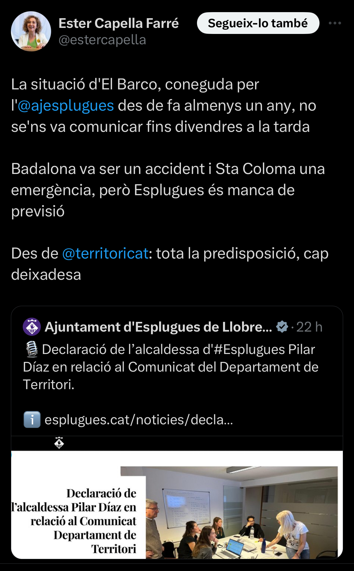 La polèmica s’ha traslladat a les xarxes: la consellera ha afirmat que “la situació d’El Barco, coneguda per l’ajuntament d’Esplugues des de fa almenys un any, no se’ns ha comunicat fins divendres a la tarda. Badalona va ser un accident, Santa Coloma una emergència , però Esplugues és manca de previsió. Des de territoi.cat tota la predisposició, cap deixadesa”.