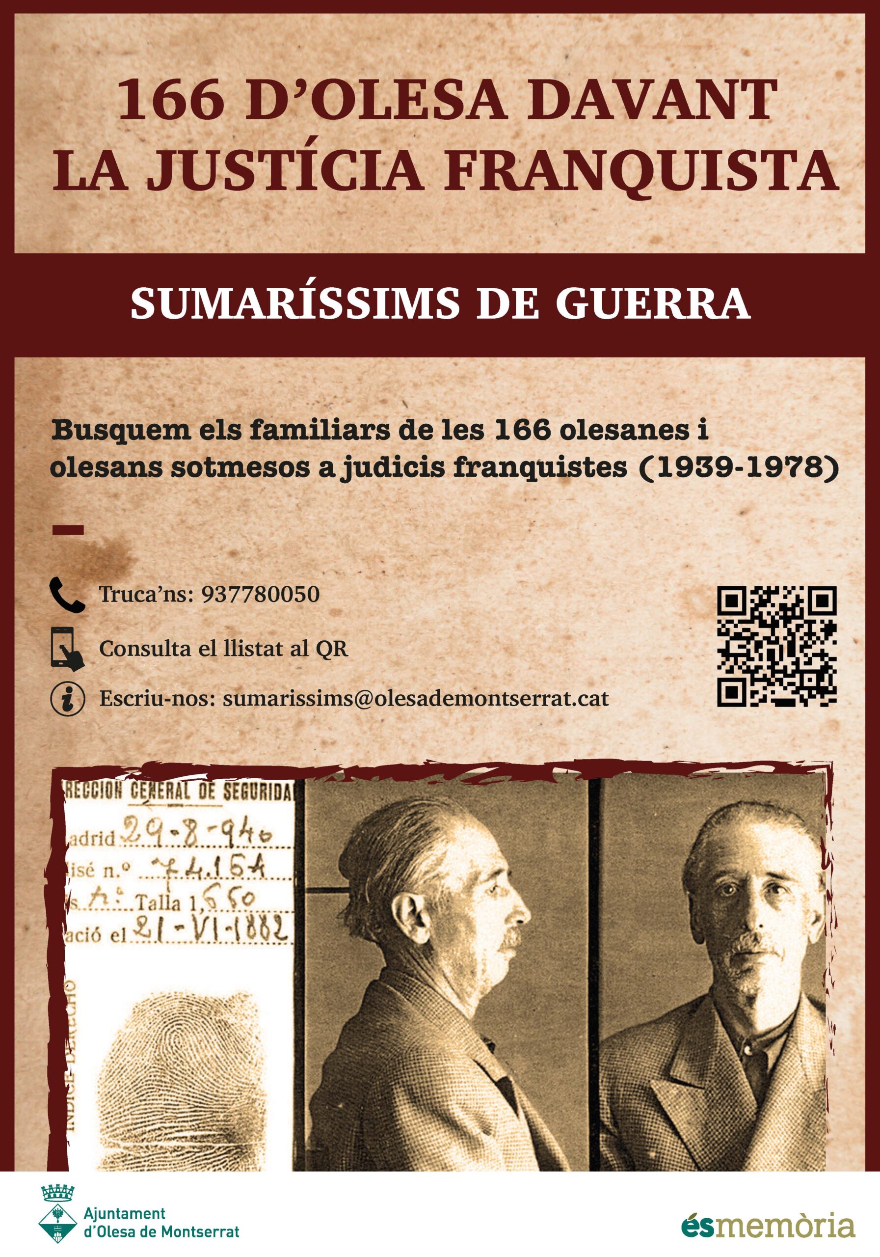 L’Ajuntament d’Olesa de Montserrat, a través de la Regidoria de Memòria Històrica, ha engegat un projecte ambiciós per localitzar els familiars de les persones que van ser sotmeses a procediments judicials militars o sumaríssims durant la Guerra Civil Espanyola i la repressió franquista.