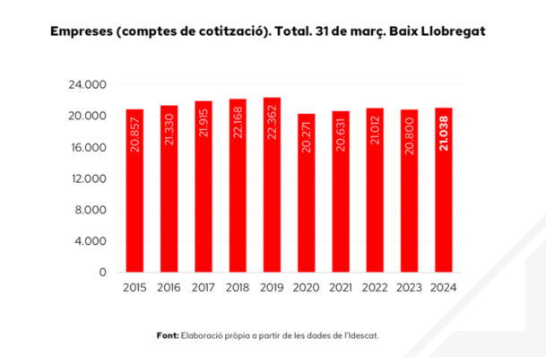 El nombre d’empreses (comptes de cotització) a la comarca se situa en 21.038 a finals de març de 2024, un 1,1% superior respecte a un any enrere (238 empreses més), un creixement molt similar al registrat pel conjunt de Catalunya (+1,2%). Així mateix, respecte al trimestre anterior (desembre del 2023) es registra un augment de 115 comptes de cotització a la comarca (+0,5%).