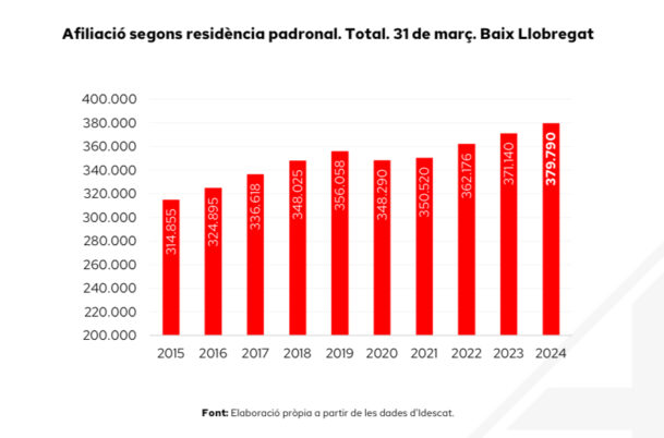 • L’afiliació segons residència padronal s’incrementa un 2,3% interanual fins a les 379.790 persones, que representa la segona xifra més elevada des del 2012.