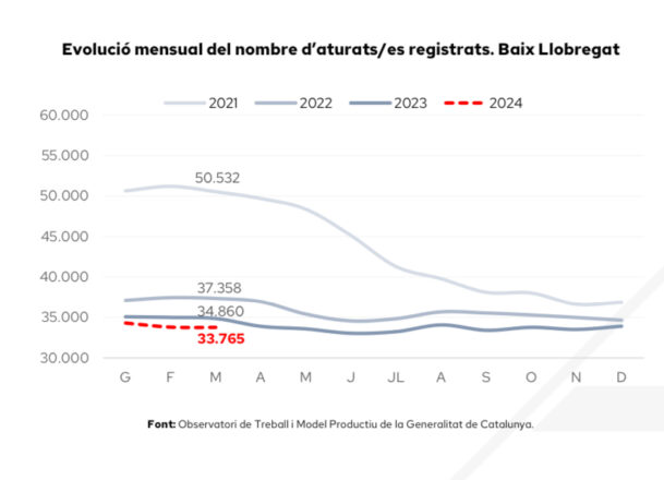Pel que fa a les xifres d’atur, el març de 2024 tanca amb 33.765 persones aturades inscrites a les oficines de Treball de Catalunya, el valor més baix per aquest mes des del 2008. Respecte a l’any anterior es registra un descens del 3,1%, disminució més intensa a la del conjunt de Catalunya (-1,1%).