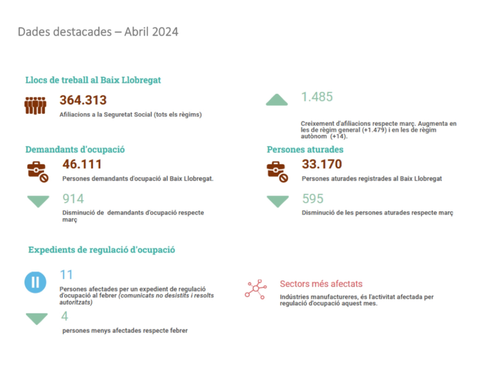 L’Observatori comarcal actualitza les dades mensuals del mercat de treball del Baix Llobregat i destaca la disminució dels demandants d’ocupació, l’atur registrat i l’augment dels llocs de treball respecte març de 2024
