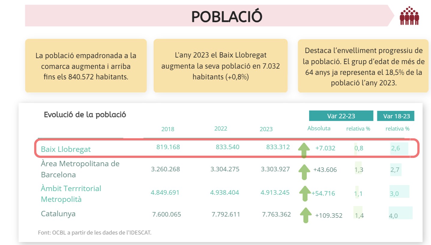 La població a la comarca augmenta (+7.032 habitants, +0,8%) fins arribar als 840.572 habitants. El creixement migratori amb l’estranger és l’únic component d’augment de població de la comarca durant el 2023. Al Baix Llobregat es van registrar 10.720 moviments més d’entrada des de l’estranger dels que es van registrar com a sortides.
