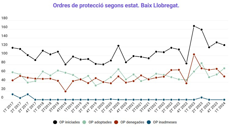 Disminueix el nombre d’ordres de protecció (124) respecte al trimestre anterior (-5%) i significativament respecte al mateix trimestre de l’any anterior (-26%). Disminueix el pes de les ordres de protecció denegades (43%) respecte el trimestre anterior (-13 p.p.) com respecte el mateix trimestre de l’any anterior (-19 p.p.).