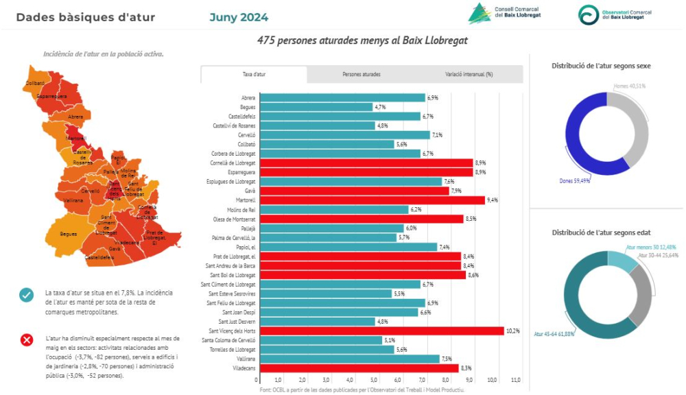 L’atur disminueix al Baix Llobregat durant el mes de juny. Amb 475 persones aturades menys que el mes passat, juny tanca amb 32.253 aturats/des. Respecte al mateix mes de l’any 2023, l’atur disminueix un 2,4% i 788 persones menys. La taxa d’atur se situa en el 7,8%, una xifra inferior a la de la resta d’àmbits territorials i del conjunt de Catalunya