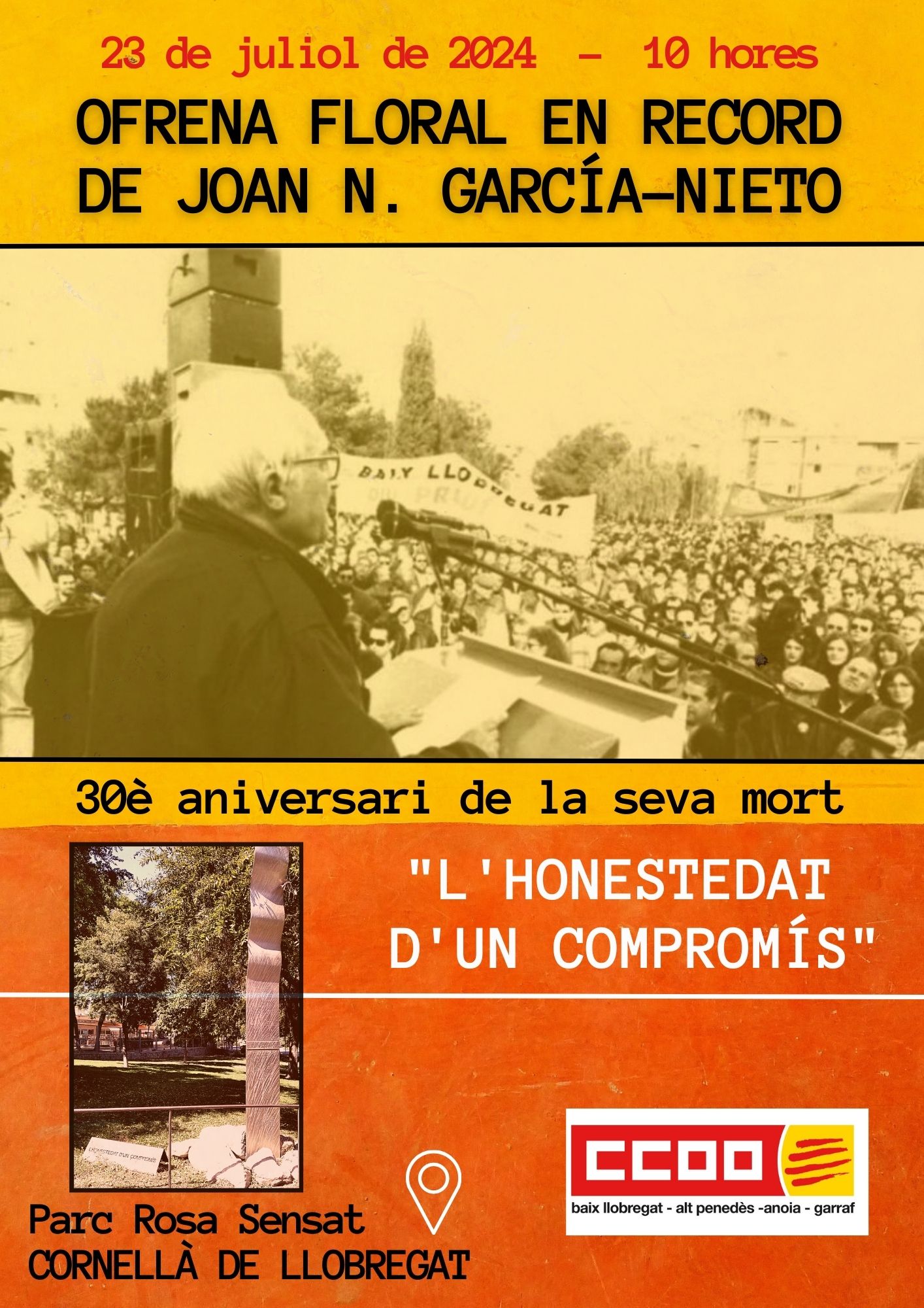 Per això, aquest dimarts, a les 10 del matí, CCOO i altres grups vinculats a García- Nieto, com els Comuns, faran una ofrena floral recordant el seu mestratge, amb el títol “L’honestedat d’un compromís”, al Parc de Rosa Sensat de Cornellà de Llobregat.