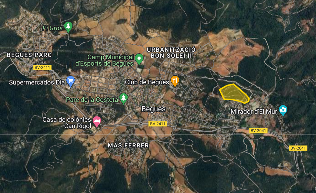 Fotografia. Imatge aèria del nucli urbà de Begues i ressaltada en color la zona de Can Amell 2: Google Maps (2024)