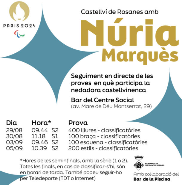 La nedadora castellvinenca Núria Marquès Soto es va classificar ahir al matí per la final dels 400 lliures en la primera de les quatre proves en què ha participat en els Jocs Paralímpics de París. Finalment va quedar en un meritori 5è lloc, després de realitzar una bona carrera en la que a prori havia de ser el seu pitjor resultat.