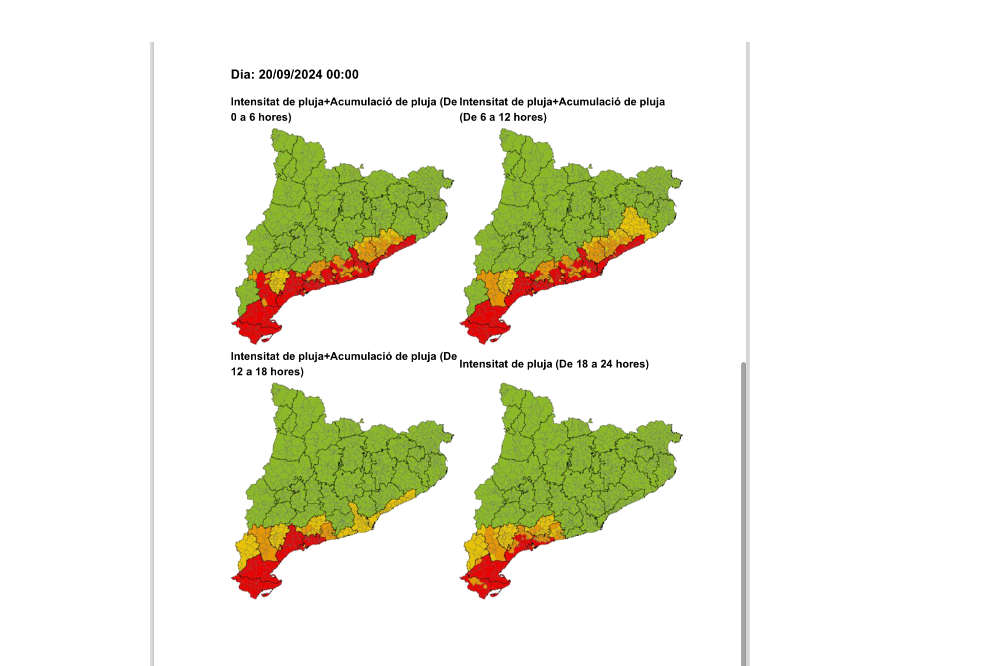 L’SMC ha informat d’un avís de perill per intensitat de pluja (40 litres/m2 en 30 minuts) a tot el litoral i prelitoral català, excepte les comarques de Girona, i amb major probabilitat a les comarques del litoral. Cal destacar que les precipitacions intenses es produiran de forma local i no a tot el territori alhora. El SMC també preveu que les pluges puguin ser persistents al litoral, sobretot al sud.