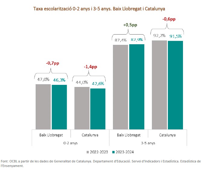 Per contra, en el segon cicle d’educació infantil (de 3 a 5 anys) la taxa d’escolarització, que posa en relació el nombre d’infants matriculats sobre el nombre d’infants residents d’entre 0 i 5 anys, es manté estable (+0,5 punts percentuals) i arriba al 87,9% tot i la caiguda tant del nombre d’infants com del nombre d’alumnes matriculats. L’indicador del Baix Llobregat és 3,6 punts percentuals inferior a la mitjana catalana (92,2%).