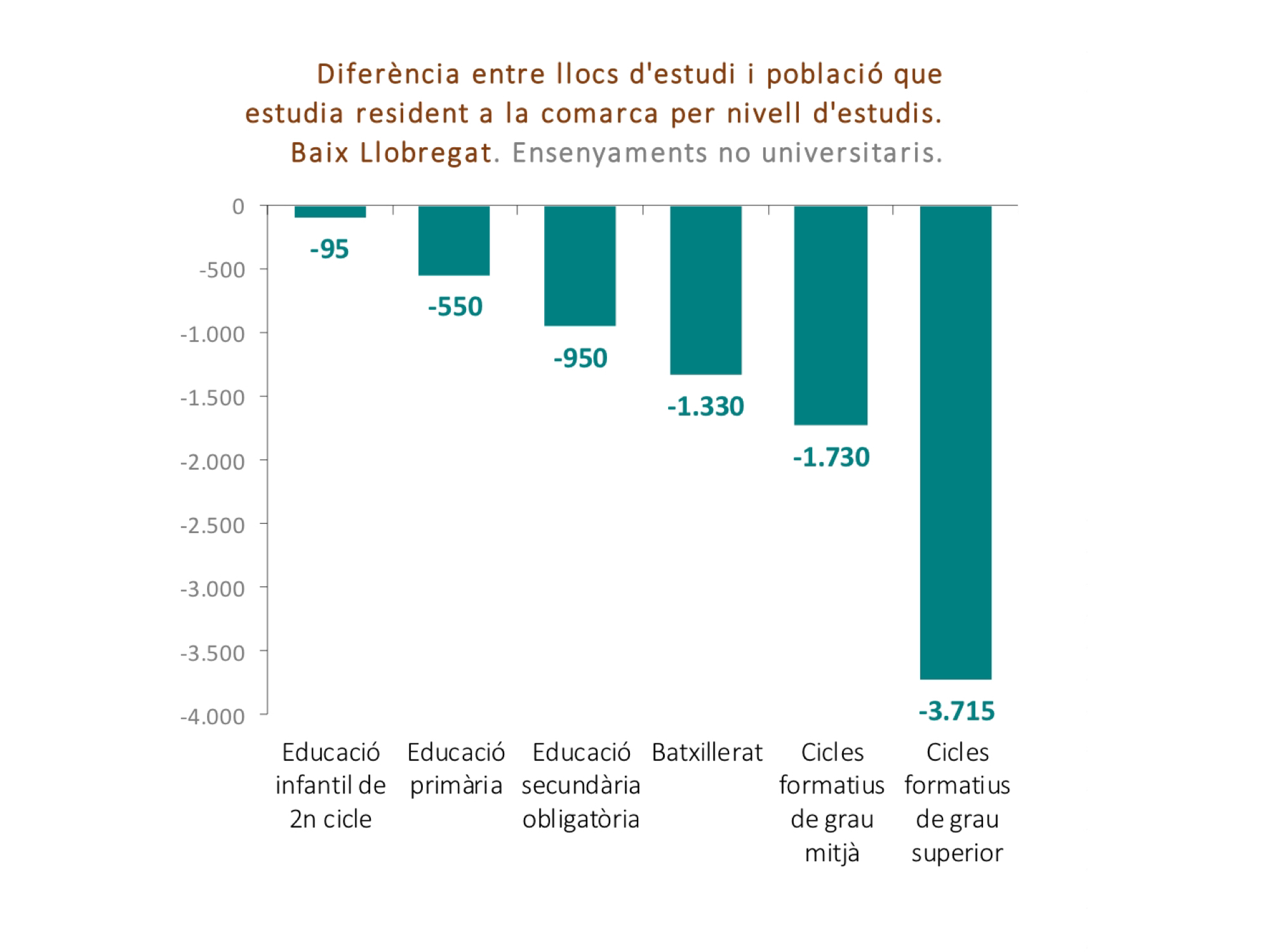 Tanmateix, si tenim en compte tots els nivells educatius, la diferència entre alumnat resident i llocs d’estudi localitzats a la comarca és negativa i se situa en -8.375.