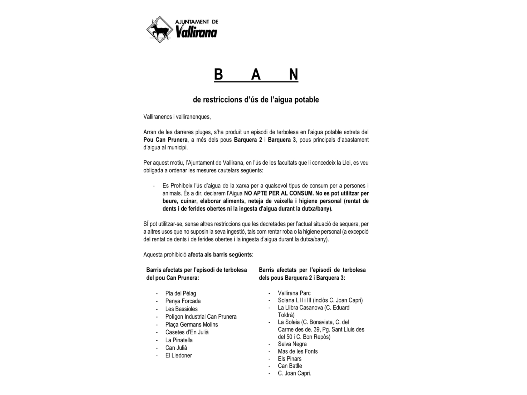 L’Ajuntament de Vallirana ha publicat un ban on es comunica que a diferents barris del municipi l’aigua de la xarxa no és apta per al consum per un episodi de terbolesa en els pous de Barquera 2, Barquera 3 i Can Prunera ocasionat per les intenses pluges dels darrers dies.