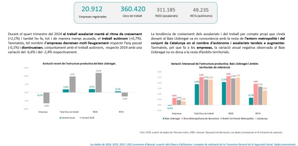 La tendència de creixement dels assalariats i del treball per compte propi que s’està donant al Baix Llobregat va en consonància amb la resta de l’entorn metropolità i del conjunt de Catalunya on el nombre d’autònoms i assalariats tendeix a augmentar. Tanmateix, pel que fa a les empreses, la variació anual negativa observada al Baix Llobregat no es dona a la resta d’àmbits territorials.