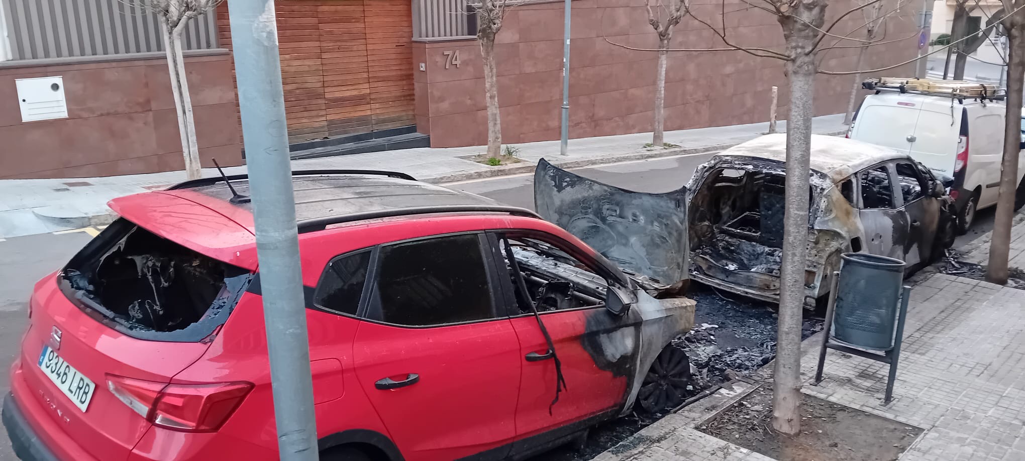 Dos cotxes han cremat (a la fotografia) fins que els Bombers de la Generalitat han aconseguit apagar el foc. Al lloc de l’incendi, que ha provocat flames de molts metres d’alçada, també s’hi han desplaçat diversos vehicles policials.