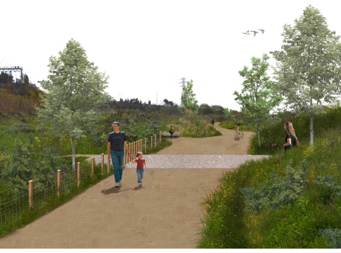 S’uniformitzarà amb un nou traçat el camí del riu, on es crearan espais de mirador, estada i repòs, que inclouran elements de mobiliari, així com l’ombra generada per la vegetació, potenciada per l’ús de solucions basades en la natura. S’eliminarà la vegetació invasora i es treballarà amb exemplars vegetals arbustius i arboris, que en el futur conformaran una estructura capaç de recuperar l’espai per convertir-lo en un refugi per a la fauna.
