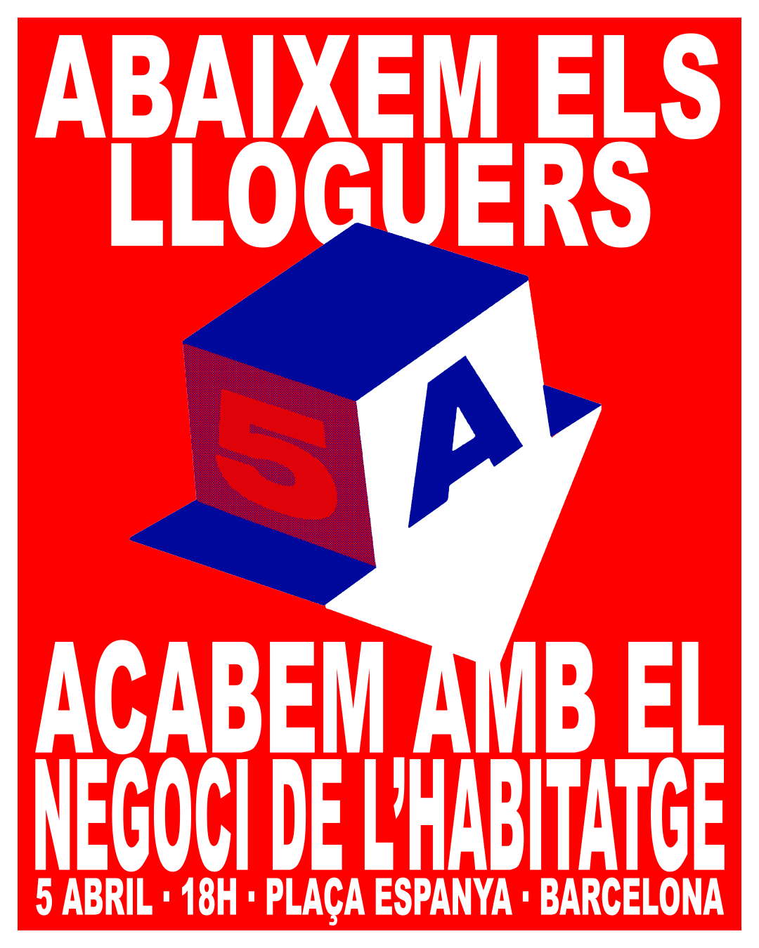 Aquest dissabte, 5 d’abril, el moviment per l’habitatge convoca la ciutadania una vegada més per reivindicar un habitatge universal i de qualitat i per dir alt i clar que cal abaixar els preus dels lloguers. Es reclama acabar amb el negoci de l’habitatge i tancar la porta als especuladors. Es vol denunciar els preus abusius, els desnonaments, els fons voltor que fan negoci i els governs que no s’atreveixen a trencar amb l’especulació.