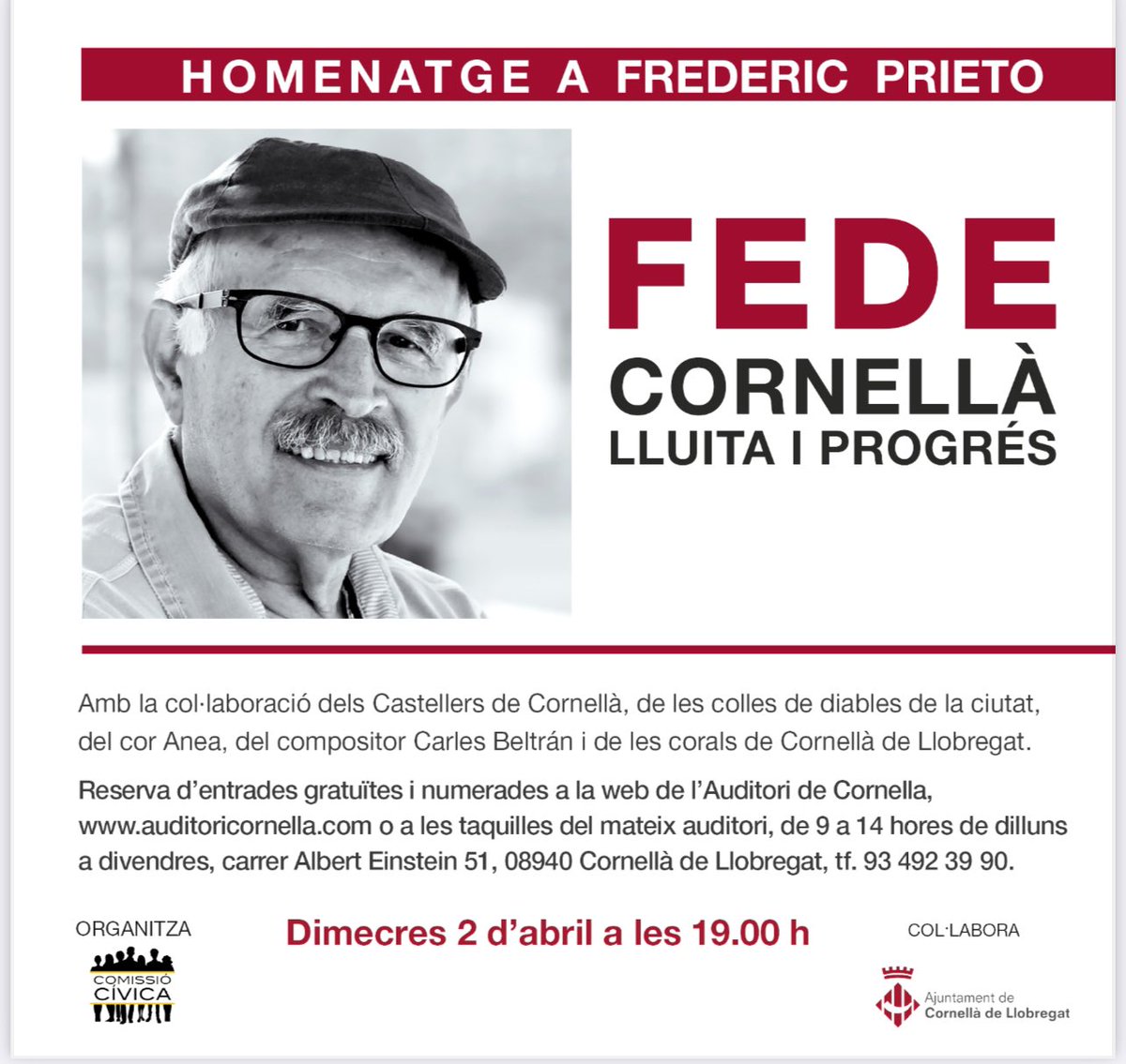 L’Auditori de Cornellà es va omplir aquest dimecres, 2 d’abril, per retre homenatge a Frederic Prieto i Caballé, alcalde de la ciutat escollit en les eleccions municipals del 3 d’abril de 1979, avui fa quaranta sis anys. Prieto també fou diputat d’Esports i Turisme de la Diputació de Barcelona, primer Síndic de Greuges local de Cornellà i president de la Taula pel Dret a Decidir del Baix Llobregat.