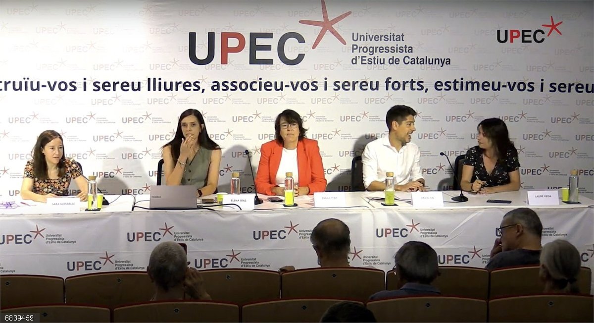 Fotografia de Laure Vega parlant amb David Cid (Comuns) en un debat entre representants de PSC, ERC, Comuns i CUP (4 de juliol de 2025): UPEC