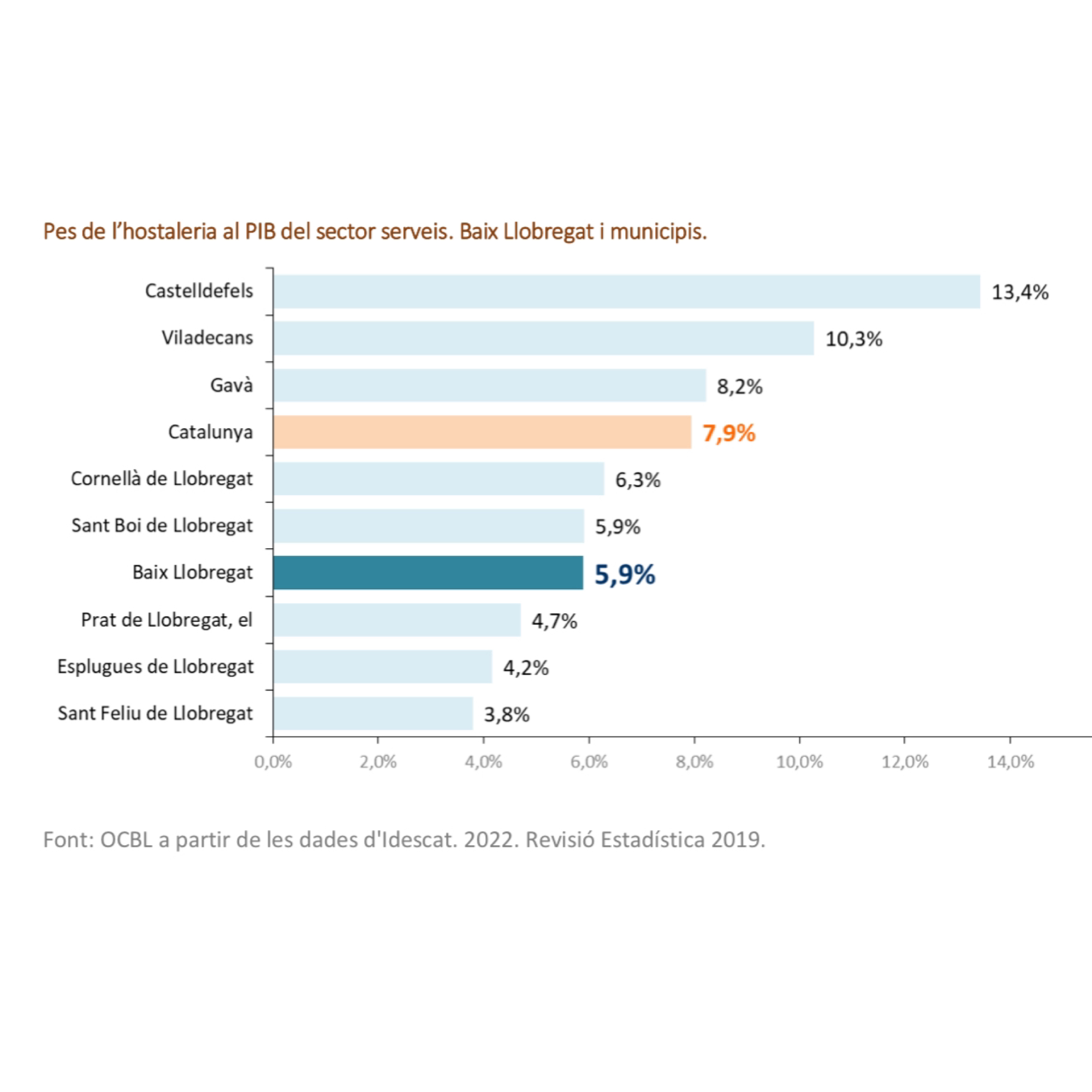 Dins l’estructura del sector turístic comarcal, les activitats de serveis de menjar i begudes concentren més del 75% de les empreses i el 61% dels llocs de treball. Les activitats esportives i d’entreteniment ocupen la segona posició (16% d’empreses i llocs de treball), seguides de lluny per l’allotjament (3% d’empreses i 4% d’ocupació). Cal destacar també el creixement relatiu de les empreses culturals (+27%) i de les activitats artístiques i d’espectacles, que augmenten un 10% en llocs de treball.