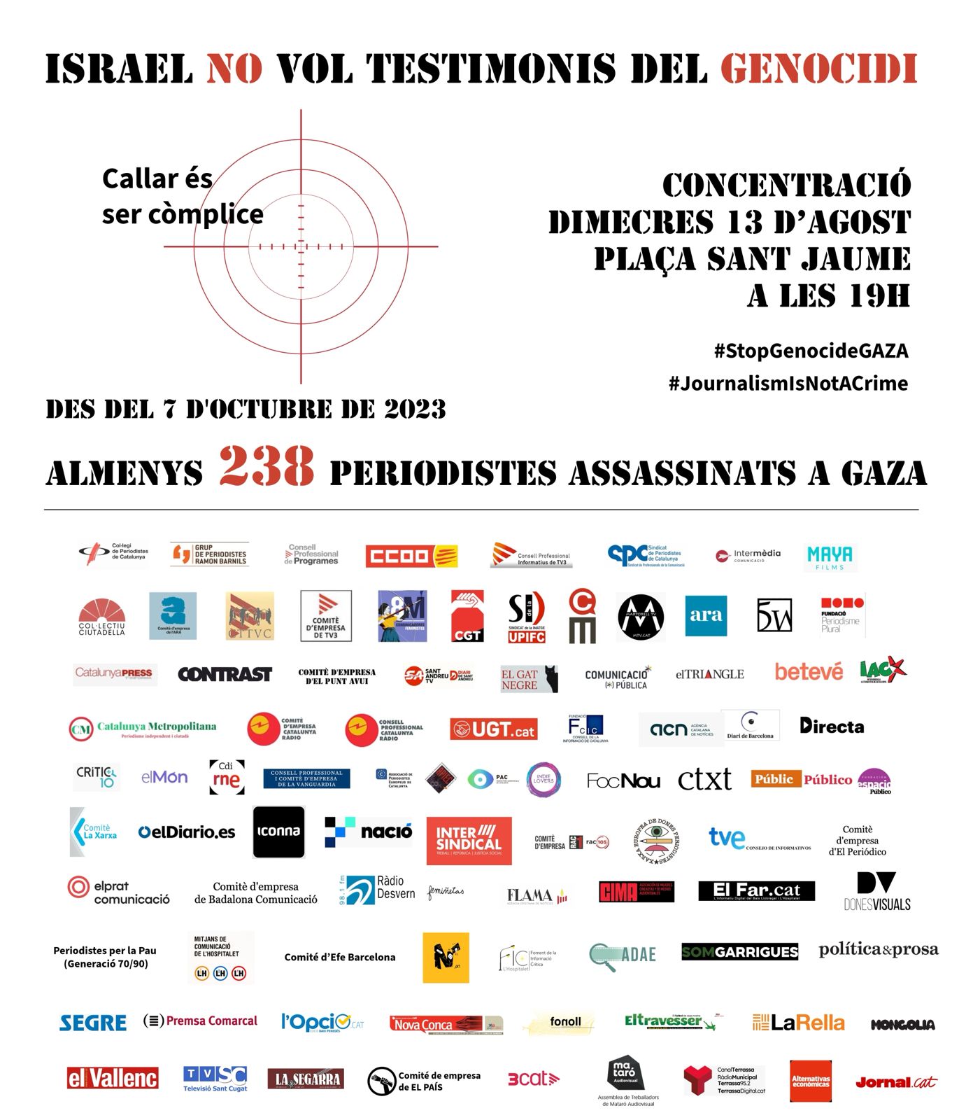 Davant aquesta situació d’odi i mort, que és també un atac a la llibertat d’expressió, diversos mitjans de comunicació, organitzacions socials i professionals han convocat avui, 13 de juliol, a les 7 de la tarda una concentració a la Plaça de Sant Jaume de Barcelona sota el lema “Israel no vol testimonis del genocidi”. Entre els convocants hi ha el Col·legi de Periodistes de Catalunya, sindicats com CCOO i UGT, els consells professionals de TV3 i Catalunya Ràdio o Betevé. ElBaix.cat s’ha sumat a la iniciativa directament i a través de Catalunya Metropolitana, que agrupa divuit mitjans de comunicació locals de l’entorn de Barcelona.