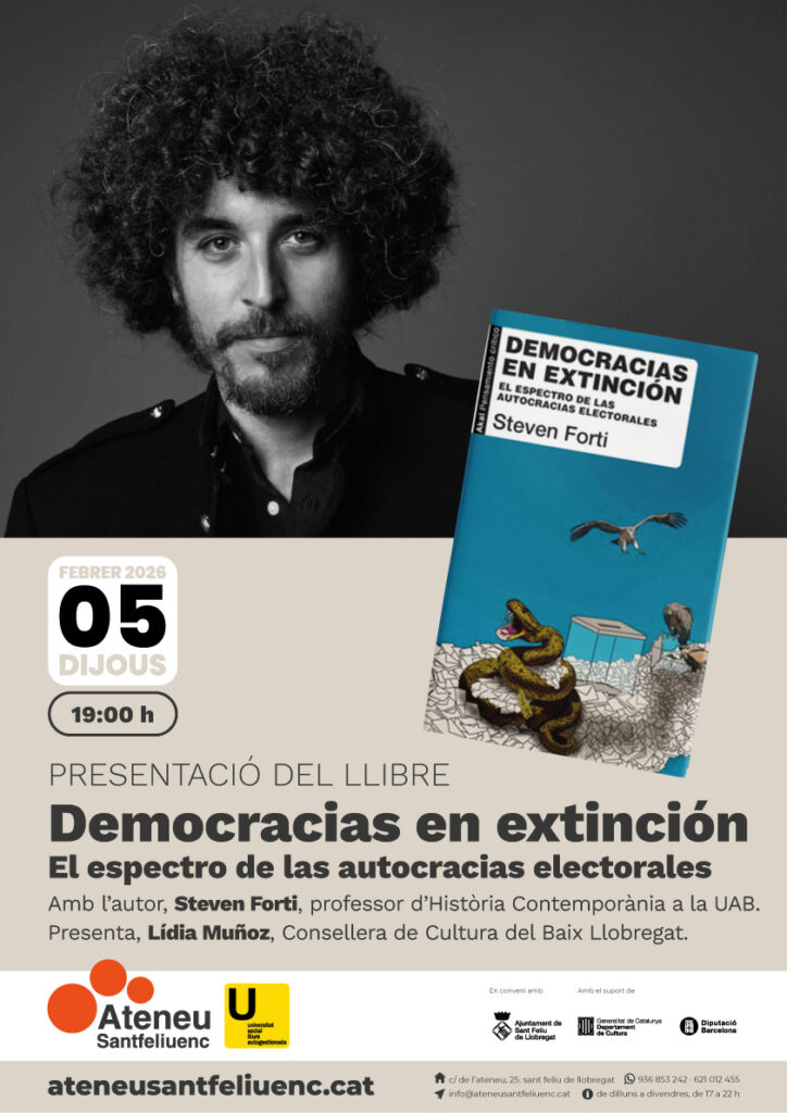 Forti presenta el seu darrer llibre, “Democracias en extinción. El espectro de las autocracias electorales” (Editorial Akal), a l’aula de Cultura de l’Ateneu, a Sant Feliu de Llobregat, en un acte organitzat per l’USLA, aquest dijous, 5 de febrer, a les 7 de la tarda. Serà presentat per Lidia Muñoz, exalcaldessa de la ciutat pels Comuns i consellera de Cultura del Baix Llobregat.
