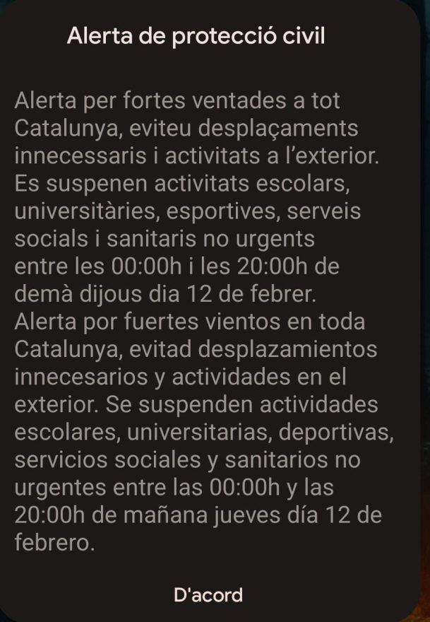 Aquest conjunt de mesures s’ha comunicat directament a la ciutadania mitjançant l’ES-Alert, que s’ha activat també al Baix Llobregat, la primera vegada que aquest sistema s’utilitza per un episodi de vent.