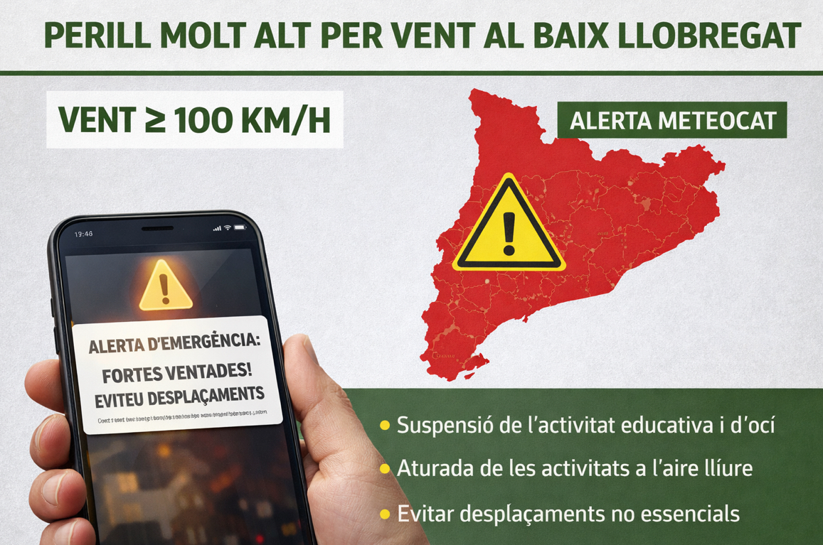 Davant la previsió de ratxes que poden superar els 100 km/h, la Generalitat ha activat mesures preventives d’abast general i ha enviat un missatge d’emergència ES-Alert als mòbils amb recomanacions clares de seguretat i mobilitat.