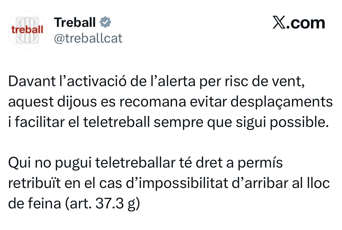 Davant l’activació de l’alerta, Treball ha fet públic que aquest dijous es recomana evitar desplaçaments i facilitar el teletreball sempre que sigui possible.