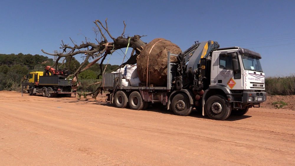 Acció protectora o agressió al medi ambient? Aquests dies han començat els treballs de trasllat (a la fotografia) i trasplantament dels arbres amb valor patrimonial o ecològic que es troben en el sector del Pla de Ponent.