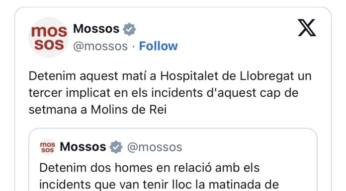 Els Mossos d'Esquadra han detingut aquest dimarts al matí a l'Hospitalet de Llobregat un tercer individu suposadament relacionat amb els aldarulls de Molins de Rei el cap de setmana passat. Els Mossos d'Esquadra tenen més persones identificades i mantenen...