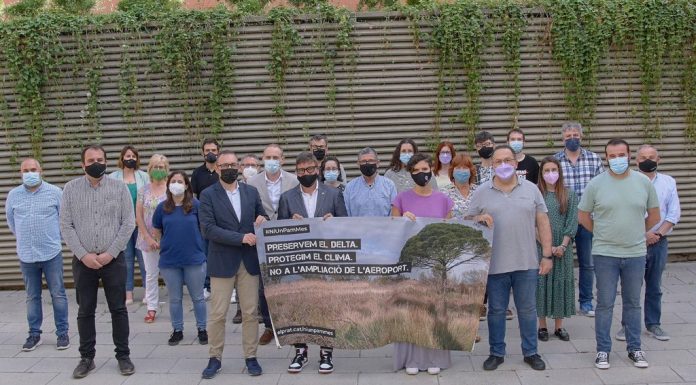 Abans d’iniciar el ple municipal del mes de juny, representants dels cinc grups municipals del Prat es van fer una fotografia conjunta per reiterar la seva negativa unànime a la proposta d’ampliació de l’aeroport del Prat