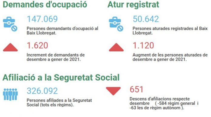 Creixen en 1.620 les demandes d’ocupació a les oficines de treball en el mes de gener. L’afiliació a la Seguretat Social disminueix en 651 persones. 14.856 persones afectades per un expedient de regulació d’ocupació al gener.