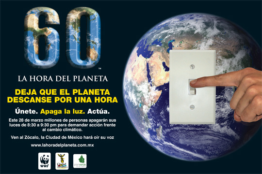 La Organización Mundial de conservación World Wildlife Fund (WWF) propone a personas, empresas, gobiernos y organizaciones de todo el mundo que el 29 de marzo apaguen sus luces durante una hora (20.30 – 21.30 h), iniciativa conocida como La Hora del Planeta, para demostrar su preocupación por el cambio climático y demostrar su compromiso para encontrar soluciones